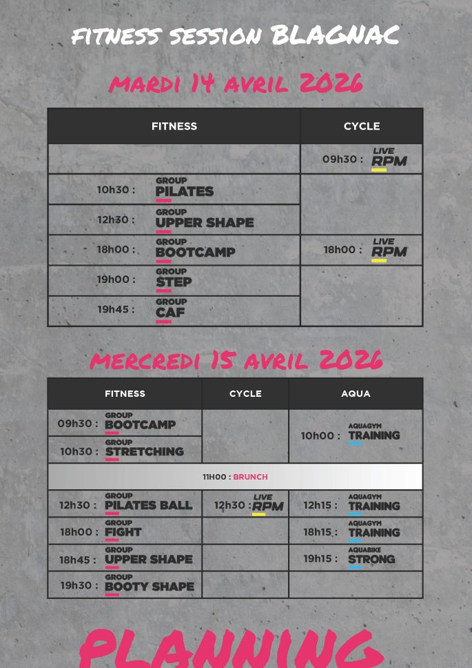 - (Re)découvrez nos cours à travers trois univers complémentaires : Fitness, Cycle et Aqua